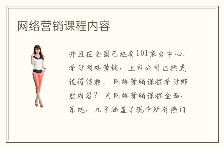 并且在全國已經(jīng)有101家分中心。學習網(wǎng)絡(luò)營銷,上市公司當然更值得信賴。 網(wǎng)絡(luò)營銷課程學習哪些內(nèi)容? 內(nèi)網(wǎng)絡(luò)營銷課程全面,系統(tǒng),幾乎涵蓋了現(xiàn)今所有熱門的營銷形式,達內(nèi)