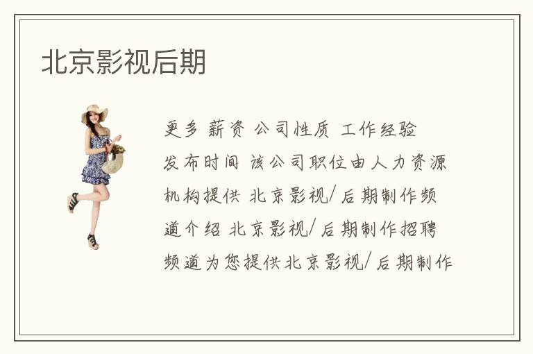 更多 薪資 公司性質(zhì) 工作經(jīng)驗(yàn) 發(fā)布時(shí)間 該公司職位由人力資源機(jī)構(gòu)提供 北京影視/后期制作頻道介紹 北京影視/后期制作招聘頻道為您提供北京影視/后期制作招聘信息,在此