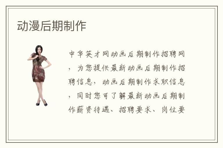 中華英才網(wǎng)動(dòng)畫后期制作招聘網(wǎng),為您提供最新動(dòng)畫后期制作招聘信息,動(dòng)畫后期制作求職信息,同時(shí)您可了解最新動(dòng)畫后期制作薪資待遇、招聘要求、崗位要求、崗位職責(zé)。中華