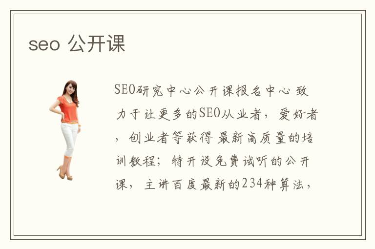 SEO研究中心公開課報(bào)名中心 致力于讓更多的SEO從業(yè)者,愛好者,創(chuàng)業(yè)者等獲得 最新高質(zhì)量的培訓(xùn)教程;特開設(shè)免費(fèi)試聽的公開課,主講百度最新的234種算法,超高人
