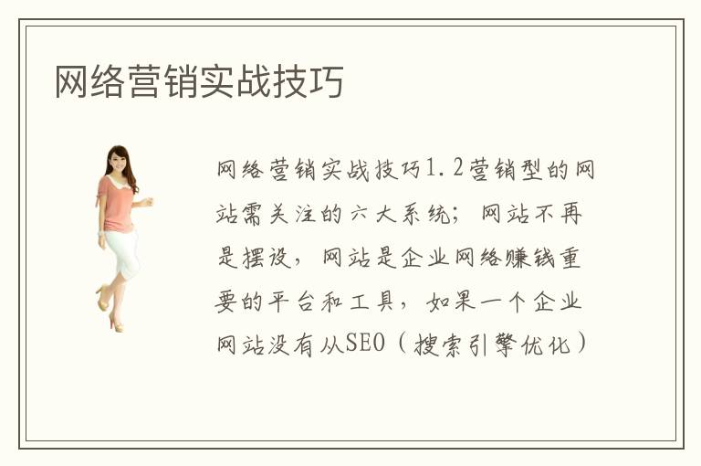 網(wǎng)絡(luò)營銷實戰(zhàn)技巧1.2營銷型的網(wǎng)站需關(guān)注的六大系統(tǒng);網(wǎng)站不再是擺設(shè),網(wǎng)站是企業(yè)網(wǎng)絡(luò)賺錢重要的平臺和工具,如果一個企業(yè)網(wǎng)站沒有從SEO(搜索引擎優(yōu)化)的角度去設(shè)計,