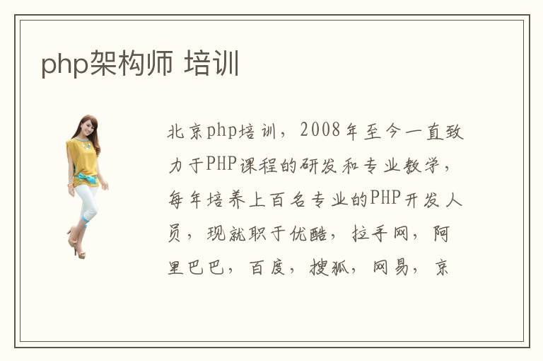 北京php培訓,2008年至今一直致力于PHP課程的研發(fā)和專業(yè)教學,每年培養(yǎng)上百名專業(yè)的PHP開發(fā)人員,現(xiàn)就職于優(yōu)酷,拉手網(wǎng),阿里巴巴,百度,搜狐,網(wǎng)易,京東商