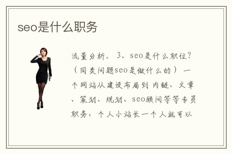 流量分析。 3、seo是什么職位?(同類問題seo是做什么的) 一個網(wǎng)站從建設(shè)布局到 內(nèi)鏈、文章、策劃、規(guī)劃、seo顧問等等專員職務(wù),個人小站長一個人就可以解決完這些