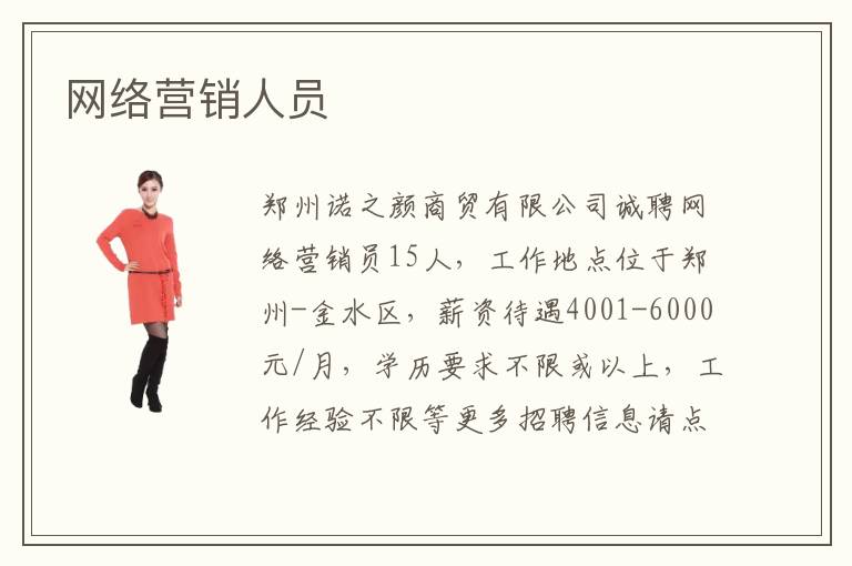 鄭州諾之顏商貿(mào)有限公司誠聘網(wǎng)絡營銷員15人,工作地點位于鄭州-金水區(qū),薪資待遇4001-6000元/月,學歷要求不限或以上,工作經(jīng)驗不限等更多招聘信息請點擊查看詳情【智聯(lián)