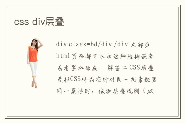 <div class="bd"></div> </div> 大部分html頁面都可以由這種結構嵌套或者累加而成。 解答二 CSS層疊是指CSS樣式在針對同一元素配置同一屬性時,依據層疊規(guī)則(權重)來