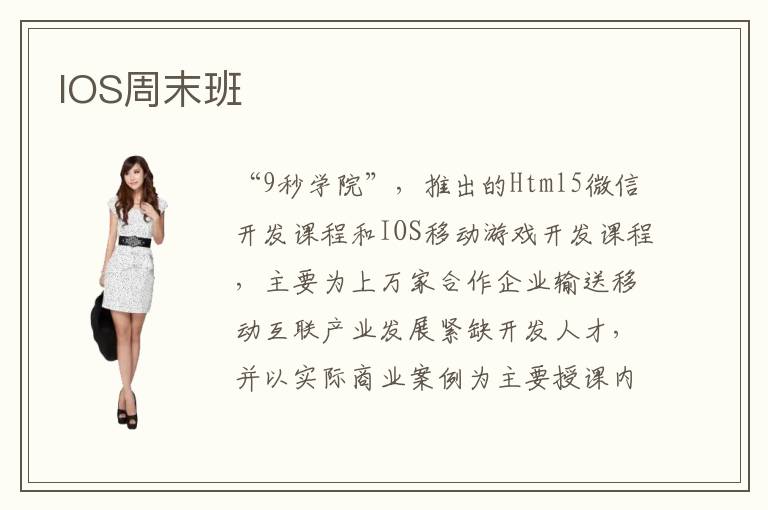 “9秒學院”,推出的Html5微信開發(fā)課程和IOS移動游戲開發(fā)課程,主要為上萬家合作企業(yè)輸送移動互聯(lián)產(chǎn)業(yè)發(fā)展緊缺開發(fā)人才,并以實際商業(yè)案例為主要授課內(nèi)容,努力打