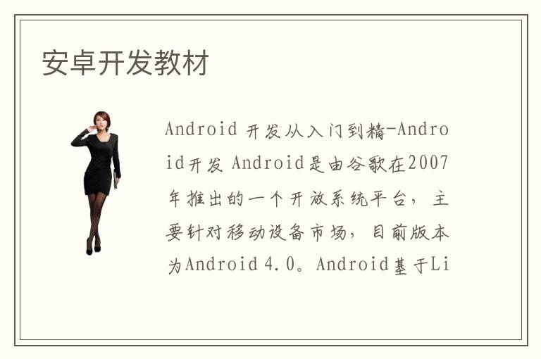 Android 開發(fā)從入門到精-Android開發(fā) Android是由谷歌在2007年推出的一個(gè)開放系統(tǒng)平臺(tái),主要針對(duì)移動(dòng)設(shè)備市場(chǎng),目前版本為Android 4.0。Android基于Linux,開發(fā)者可以使用