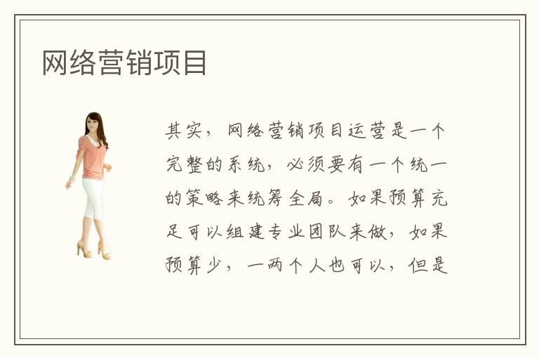 其實,網(wǎng)絡(luò)營銷項目運營是一個完整的系統(tǒng),必須要有一個統(tǒng)一的策略來統(tǒng)籌全局。如果預算充足可以組建專業(yè)團隊來做,如果預算少,一兩個人也可以,但是一定要思路清晰、策