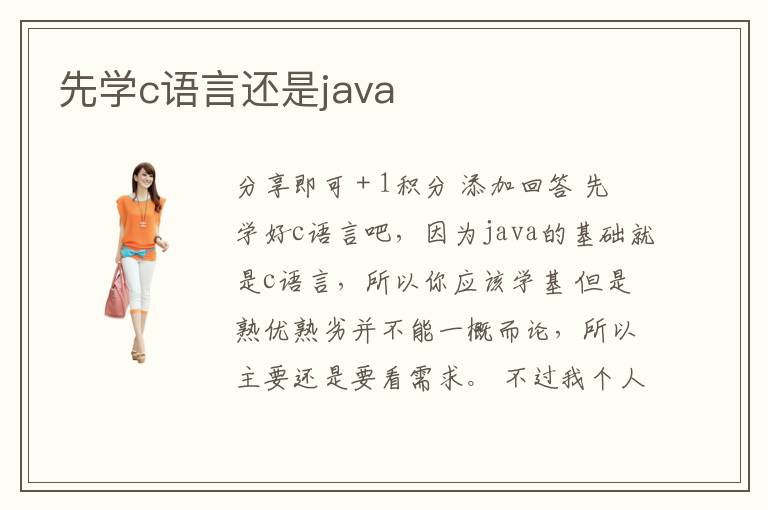 分享即可 + 1積分 添加回答 先學(xué)好c語言吧,因?yàn)閖ava的基礎(chǔ)就是c語言,所以你應(yīng)該學(xué)基 但是熟優(yōu)熟劣并不能一概而論,所以主要還是要看需求。 不過我個(gè)人建議你可以從簡(jiǎn)單的