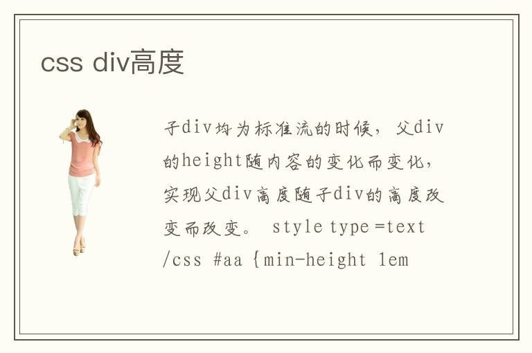 子div均為標(biāo)準(zhǔn)流的時(shí)候,父div的height隨內(nèi)容的變化而變化,實(shí)現(xiàn)父div高度隨子div的高度改變而改變。 < style type ="text/css" > #aa { min-height 1em ; } #bb { height 55px ; }