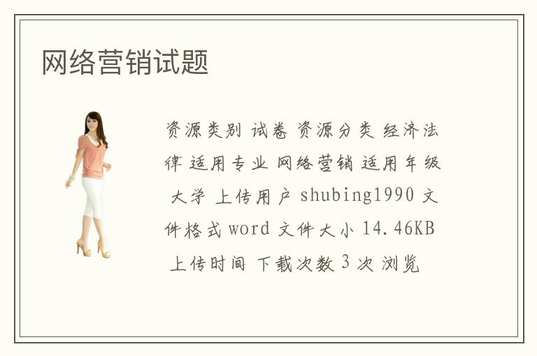 資源類別 試卷 資源分類 經(jīng)濟(jì)法律 適用專業(yè) 網(wǎng)絡(luò)營(yíng)銷 適用年級(jí) 大學(xué) 上傳用戶 shubing1990 文件格式 word 文件大小 14.46KB 上傳時(shí)間 下載次數(shù) 3 次 瀏覽次數(shù)
