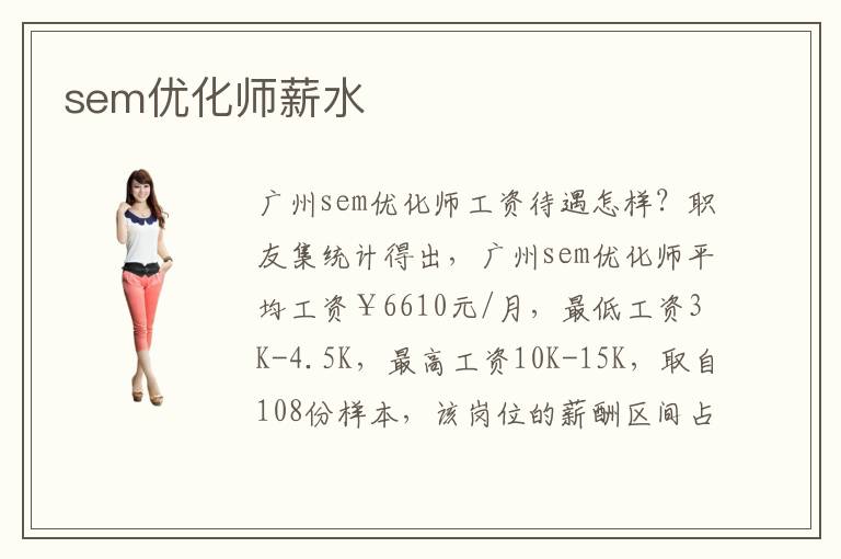 上海sem優(yōu)化師工資待遇怎樣?職友集統(tǒng)計得出,上海sem優(yōu)化師平均工資¥8110元/月,最低工資3K-4.5K,最高工資20K-30K,取自285份樣本,該崗位的薪酬區(qū)間占比,工作經