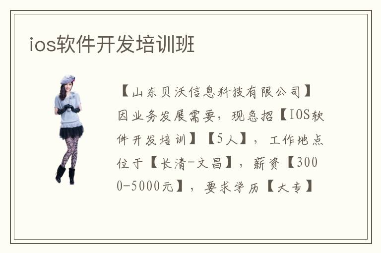 【山東貝沃信息科技有限公司】因業(yè)務(wù)發(fā)展需要,現(xiàn)急招【IOS軟件開發(fā)培訓(xùn)】【5人】,工作地點(diǎn)位于【長清-文昌】,薪資【3000-5000元】,要求學(xué)歷【大?!?,工作經(jīng)驗(yàn)【不
