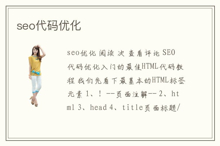 seo優(yōu)化 閱讀 次 查看評論 SEO代碼優(yōu)化入門的最佳HTML代碼教程 我們先看下最基本的HTML標(biāo)簽元素 1、<!--頁面注解--> 2、<html> 3、<head> 4、<title>頁面標(biāo)題</title> 5、