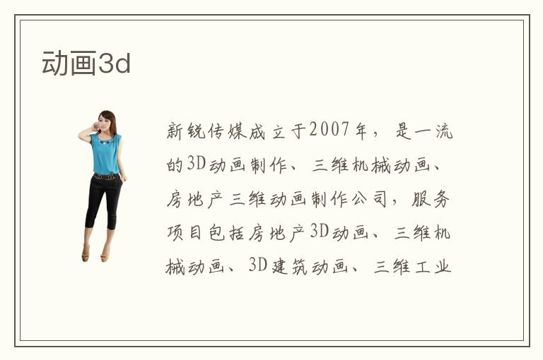 新銳傳媒成立于2007年,是一流的3D動畫制作、三維機(jī)械動畫、房地產(chǎn)三維動畫制作公司,服務(wù)項目包括房地產(chǎn)3D動畫、三維機(jī)械動畫、3D建筑動畫、三維工業(yè)動畫等。合作客戶