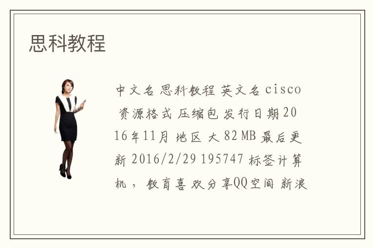 中文名 思科教程 英文名 cisco 資源格式 壓縮包 發(fā)行日期 2016年11月 地區(qū) 大 82 MB 最后更新 2016/2/29 195747 標(biāo)簽計算機(jī) ,教育喜 歡分享QQ空間 新浪微博 騰訊