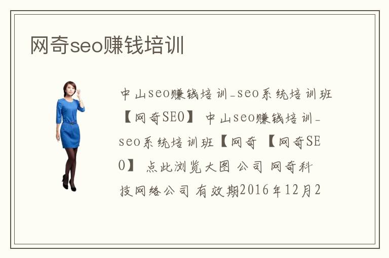 中山seo賺錢培訓(xùn)_seo系統(tǒng)培訓(xùn)班【網(wǎng)奇SEO】 中山seo賺錢培訓(xùn)_seo系統(tǒng)培訓(xùn)班【網(wǎng)奇 【網(wǎng)奇SEO】 點(diǎn)此瀏覽大圖 公司 網(wǎng)奇科技網(wǎng)絡(luò)公司 有效期2016年12月21日 聯(lián)系人
