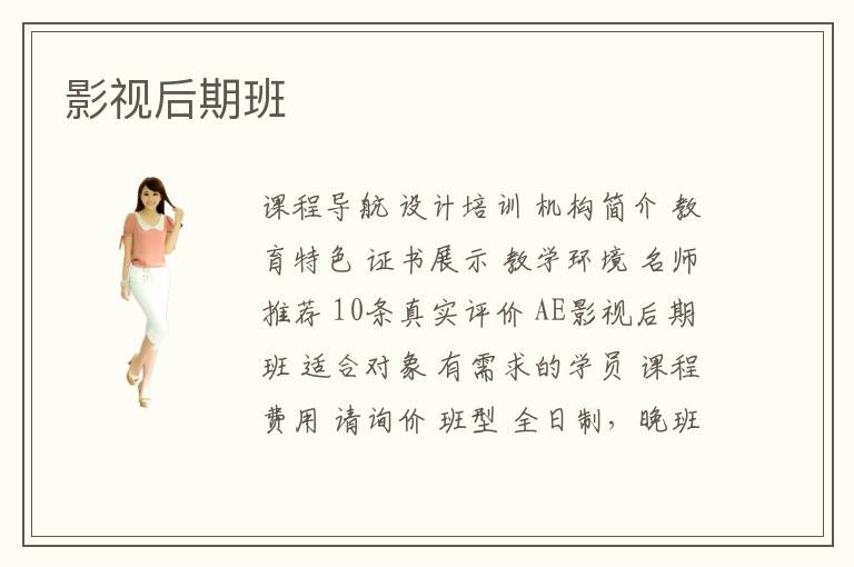 課程導(dǎo)航 設(shè)計培訓(xùn) 機(jī)構(gòu)簡介 教育特色 證書展示 教學(xué)環(huán)境 名師推薦 10條真實評價 AE影視后期班 適合對象 有需求的學(xué)員 課程費用 請詢價 班型 全日制,晚班,周六上午,暑