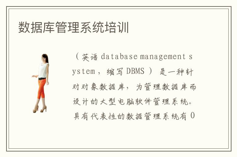 (英語 database management system ,縮寫 DBMS ) 是一種針對對象數(shù)據(jù)庫,為管理數(shù)據(jù)庫而設計的大型電腦軟件管理系統(tǒng)。具有代表性的數(shù)據(jù)管理系統(tǒng)有 Oracle 、