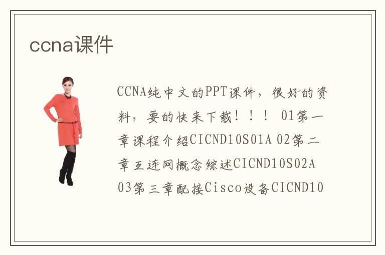 CCNA純中文的PPT課件,很好的資料,要的快來下載?。?! 01第一章課程介紹CICND10S01A 02第二章互連網(wǎng)概念綜述CICND10S02A 03第三章配接Cisco設(shè)備CICND10S03A