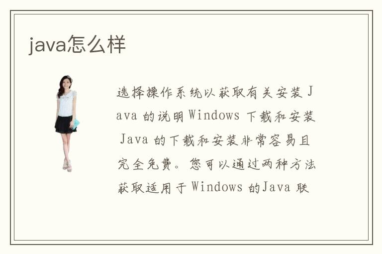 選擇操作系統(tǒng)以獲取有關(guān)安裝 Java 的說明 Windows 下載和安裝 Java 的下載和安裝非常容易且完全免費。您可以通過兩種方法獲取適用于 Windows 的Java 聯(lián)機下載 脫機下載