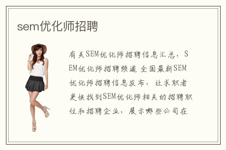 有關(guān)SEM優(yōu)化師招聘信息匯總,SEM優(yōu)化師招聘頻道 全國(guó)最新SEM優(yōu)化師招聘信息發(fā)布,讓求職者更快找到SEM優(yōu)化師相關(guān)的招聘職位和招聘企業(yè),展示哪些公司在招聘SEM優(yōu)