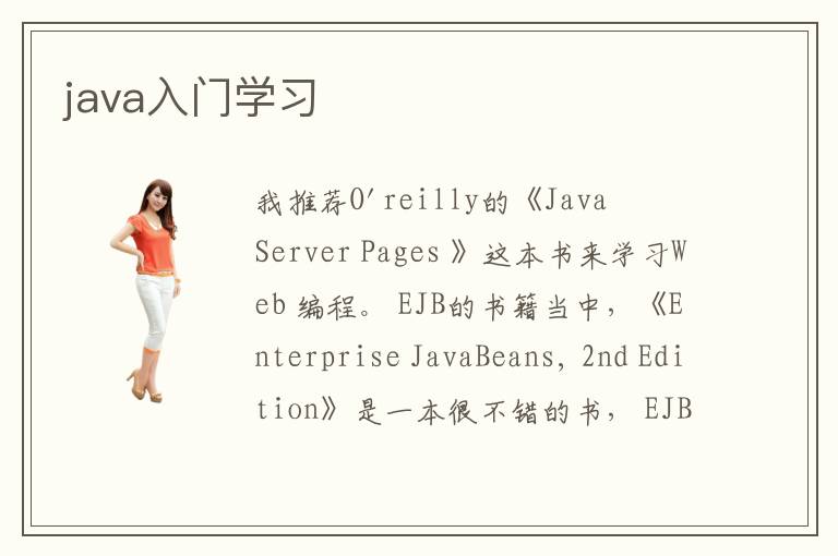 我推薦O\'reilly的《Java Server Pages 》這本書來學(xué)習(xí)Web 編程。 EJB的書籍當(dāng)中,《Enterprise JavaBeans, 2nd Edition》是一本很不錯的書, EJB的學(xué)習(xí)門檻是比較高,入門很