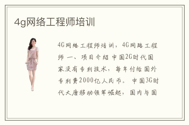 4G網(wǎng)絡(luò)工程師培訓(xùn),4G網(wǎng)路工程師 一、項(xiàng)目介紹 中國2G時(shí)代國家沒有專利技術(shù),每年付給國外專利費(fèi)2000億人民幣。 中國3G時(shí)代大唐移動(dòng)領(lǐng)軍崛起,國內(nèi)與國外3G并存。 中國
