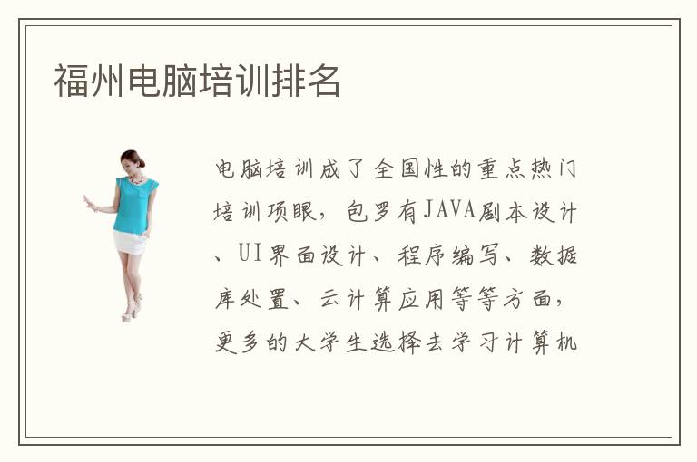 電腦培訓(xùn)成了全國性的重點熱門培訓(xùn)項眼,包羅有JAVA劇本設(shè)計、UI界面設(shè)計、程序編寫、數(shù)據(jù)庫處置、云計算應(yīng)用等等方面,更多的大學(xué)生選擇去學(xué)習(xí)計算機(jī),是以動員了計算機(jī)培訓(xùn)學(xué)校的建立和增加。福州電腦培訓(xùn)排名存在比較高的參考代價,可是,也不克完整依靠于福州電腦培訓(xùn)電腦培訓(xùn)排名表來選擇培訓(xùn)學(xué)校學(xué)習(xí)。福州地域電腦培訓(xùn)機(jī)構(gòu)優(yōu)異嗎?福州電腦培訓(xùn)費用要多少?福州電腦培訓(xùn)排名推薦電腦學(xué)校