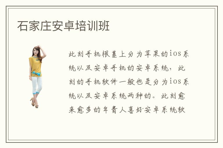 此刻手機(jī)根基上分為蘋果的ios系統(tǒng)以及安卓手機(jī)的安卓系統(tǒng),此刻的手機(jī)軟件一般也是分為ios系統(tǒng)以及安卓系統(tǒng)兩種的。此刻愈來愈多的年青人喜好安卓系統(tǒng)軟件設(shè)計(jì)編寫與開發(fā)這個(gè)職業(yè),開發(fā)研討安卓系統(tǒng)與軟件固然需要把握java語言,c語言等等電腦it技術(shù)。石家莊有幾家安卓培訓(xùn)班呢?石家莊安卓培訓(xùn)班在哪里?上面我就來告知人人這些成績的應(yīng)案吧。石家莊安卓培訓(xùn)班推薦電腦學(xué)校