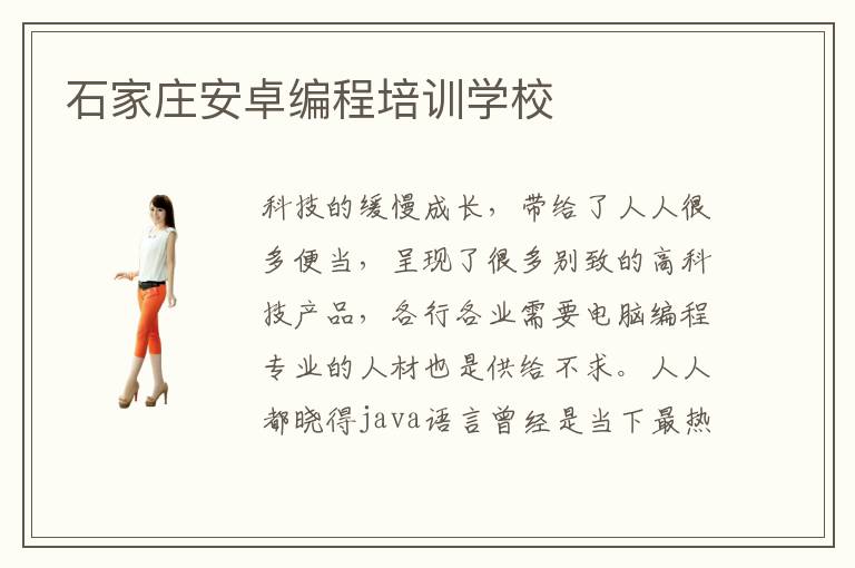 科技的緩慢成長(zhǎng),帶給了人人很多便當(dāng),呈現(xiàn)了很多別致的高科技產(chǎn)品,各行各業(yè)需要電腦編程專業(yè)的人材也是供給不求。人人都曉得java語(yǔ)言曾經(jīng)是當(dāng)下最熱門,應(yīng)用最普遍的語(yǔ)言了。固然編程也是一門很有難度,很有技術(shù)的課程,其實(shí)不是每位學(xué)習(xí)編程的人都能很好的把握好編程的方法,成為優(yōu)異的員工。這就需要人人謹(jǐn)嚴(yán)選擇一個(gè)好的編程專修學(xué)院了。那末作為培育了多量精英的石家莊安卓編程培訓(xùn)學(xué)校怎么樣呢?石家莊安卓編程培訓(xùn)推薦電腦學(xué)校