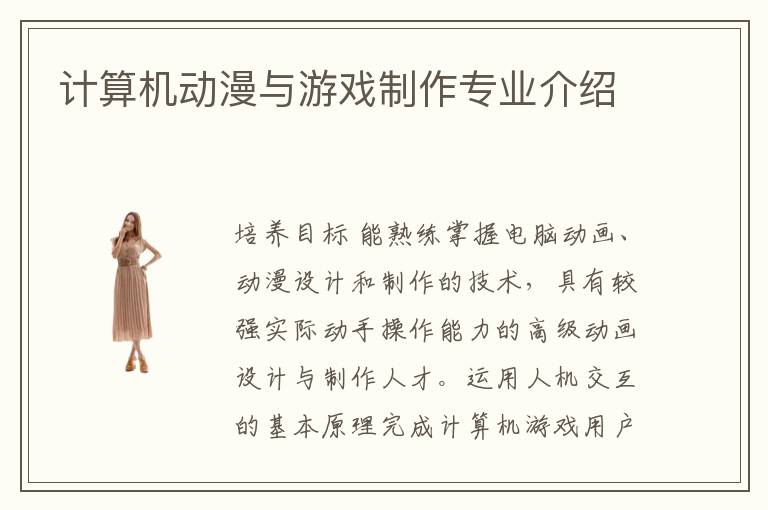 培養(yǎng)目標 能熟練掌握電腦動畫、動漫設計和制作的技術(shù),具有較強實際動手操作能力的高級動畫設計與制作人才。運用人機交互的基本原理完成計算機游戲用戶界面的設計與實現(xiàn)