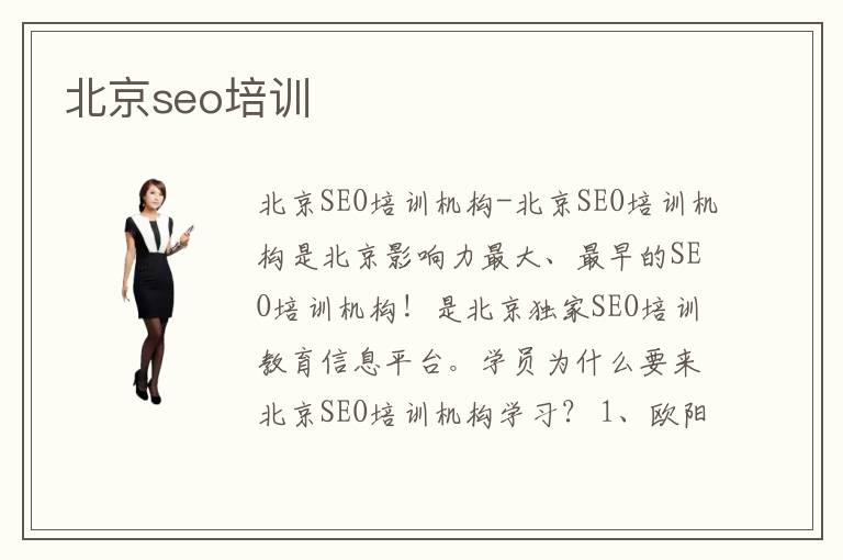 北京SEO培訓(xùn)機(jī)構(gòu)-北京SEO培訓(xùn)機(jī)構(gòu)是北京影響力最大、最早的SEO培訓(xùn)機(jī)構(gòu)!是北京獨(dú)家SEO培訓(xùn)教育信息平臺(tái)。學(xué)員為什么要來北京SEO培訓(xùn)機(jī)構(gòu)學(xué)習(xí)? 1、歐陽淳老師憑借