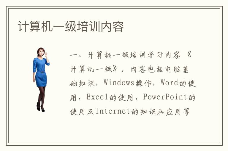 一、計算機(jī)一級培訓(xùn)學(xué)習(xí)內(nèi)容 《計算機(jī)一級》。內(nèi)容包括電腦基礎(chǔ)知識,Windows操作,Word的使用,Excel的使用,PowerPoint的使用及Internet的知識和應(yīng)用等,獲得證書自