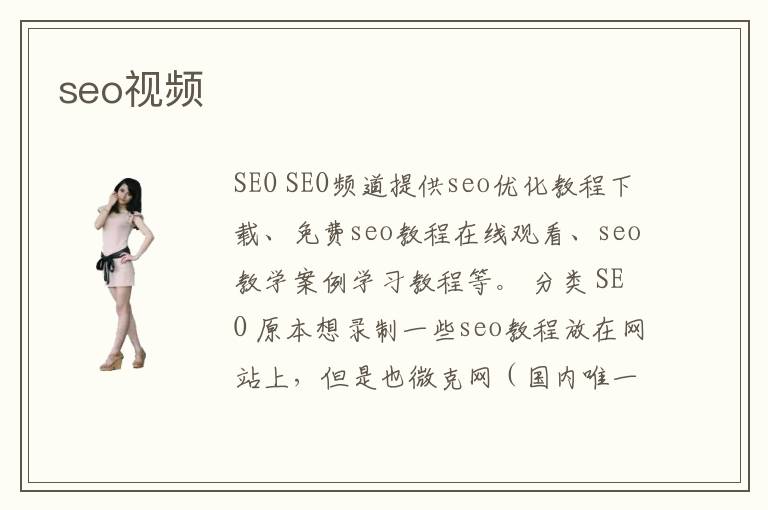 SEO SEO頻道提供seo優(yōu)化教程下載、免費seo教程在線觀看、seo教學(xué)案例學(xué)習(xí)教程等。 分類 SEO 原本想錄制一些seo教程放在網(wǎng)站上,但是也