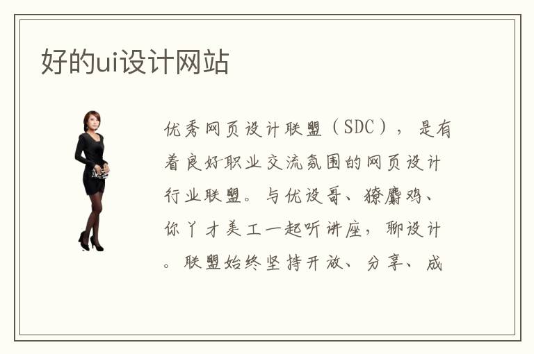 優(yōu)秀網(wǎng)頁(yè)設(shè)計(jì)聯(lián)盟(SDC),是有著良好職業(yè)交流氛圍的網(wǎng)頁(yè)設(shè)計(jì)行業(yè)聯(lián)盟。與優(yōu)設(shè)哥、獠麝雞、你丫才美工一起聽(tīng)講座,聊設(shè)計(jì)。聯(lián)盟始終堅(jiān)持開(kāi)放、分享、成長(zhǎng)的宗旨,為會(huì)員