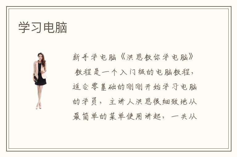 新手學(xué)電腦《洪恩教你學(xué)電腦》 教程是一個(gè)入門級(jí)的電腦教程,適合零基礎(chǔ)的剛剛開始學(xué)習(xí)電腦的學(xué)員,主講人洪恩很細(xì)致地從最簡(jiǎn)單的菜單使用講起,一共從五大方面把電腦初級(jí)
