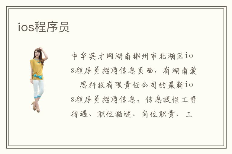 中華英才網(wǎng)湖南郴州市北湖區(qū)ios程序員招聘信息頁面,有湖南愛愽思科技有限責(zé)任公司的最新ios程序員招聘信息,信息提供工資待遇、職位描述、崗位職責(zé)、工作內(nèi)容、工作地點(diǎn)