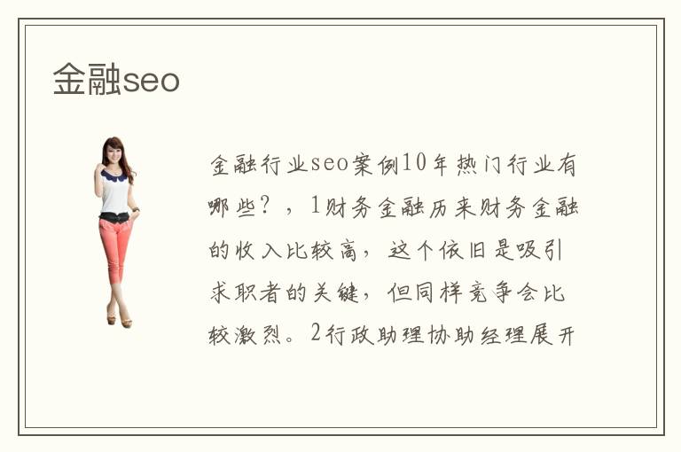 金融行業(yè)seo案例10年熱門行業(yè)有哪些?,1財務金融歷來財務金融的收入比較高,這個依舊是吸引求職者的關(guān)鍵,但同樣競爭會比較激烈。2行政助理協(xié)助經(jīng)理展開工作,行政助理