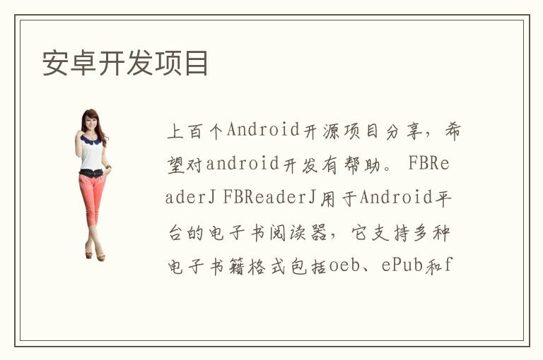 上百個(gè)Android開源項(xiàng)目分享,希望對(duì)android開發(fā)有幫助。 FBReaderJ FBReaderJ用于Android平臺(tái)的電子書閱讀器,它支持多種電子書籍格式包括oeb、ePub和fb2。此外還支