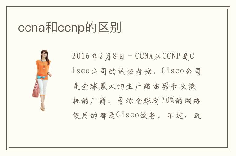 2016年2月8日 - CCNA和CCNP是Cisco公司的認證考試,Cisco公司是全球最大的生產路由器和交換機的廠商。號稱全球有70%的網絡使用的都是Cisco設備。不過,近幾年在路
