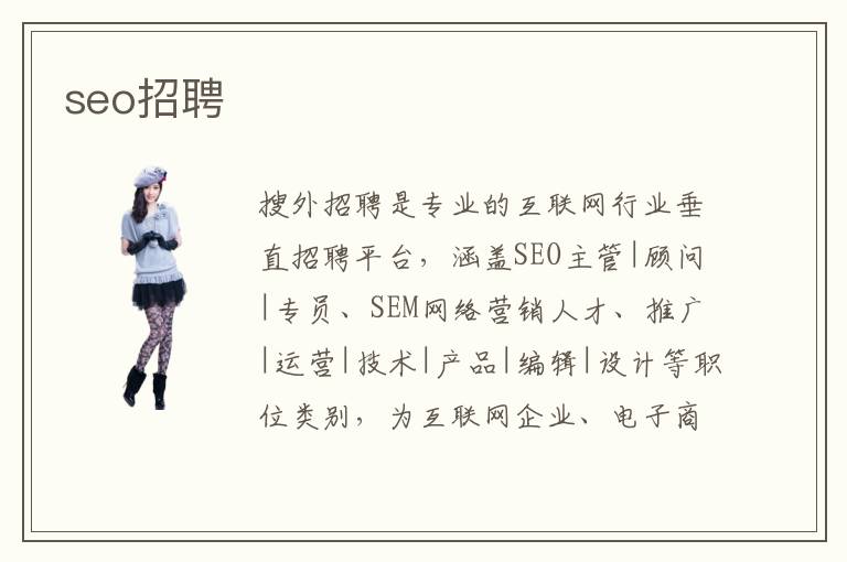 搜外招聘是專(zhuān)業(yè)的互聯(lián)網(wǎng)行業(yè)垂直招聘平臺(tái),涵蓋SEO主管|顧問(wèn)|專(zhuān)員、SEM網(wǎng)絡(luò)營(yíng)銷(xiāo)人才、推廣|運(yùn)營(yíng)|技術(shù)|產(chǎn)品|編輯|設(shè)計(jì)等職位類(lèi)別,為互聯(lián)網(wǎng)企業(yè)、電子商務(wù)企業(yè)、醫(yī)療企業(yè)、