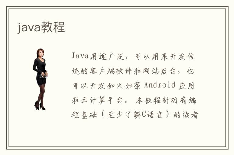 Java用途廣泛,可以用來開發(fā)傳統(tǒng)的客戶端軟件和網(wǎng)站后臺,也可以開發(fā)如火如荼 Android 應(yīng)用和云計算平臺。 本教程針對有編程基礎(chǔ)(至少了解C語言)的讀者,閱讀完所有文章