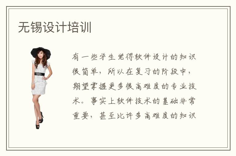 有一些學生覺得軟件設(shè)計的知識很簡單,所以在復習的階段中,期望掌握更多很高難度的專業(yè)技術(shù)。事實上軟件技術(shù)的基礎(chǔ)非常重要,甚至比許多高難度的知識點重要很多,因為同學缺乏良好的基礎(chǔ),在以后的應用過程中會相當吃力,也沒有辦法真正去理解一些重要領(lǐng)域的內(nèi)容。無錫設(shè)計培訓設(shè)計培訓學校的類型特別豐富,基本每一個學校都有不一樣的側(cè)重點和教學形式,比如部分院校更加注重的是學生的基礎(chǔ),還有部分院校更加看重同學的個性發(fā)展。設(shè)計培訓老師的能力非常厲害,會分析同學的問題和弱項,然后找到具體原因,安排補習課程。同學跟上老師的節(jié)奏,慢慢學習這些重點知識,會有很大的進步。軟件設(shè)計要學些什么,主要有電子技術(shù)、軟件工程、計算機操作系統(tǒng)、數(shù)據(jù)結(jié)構(gòu)等等。