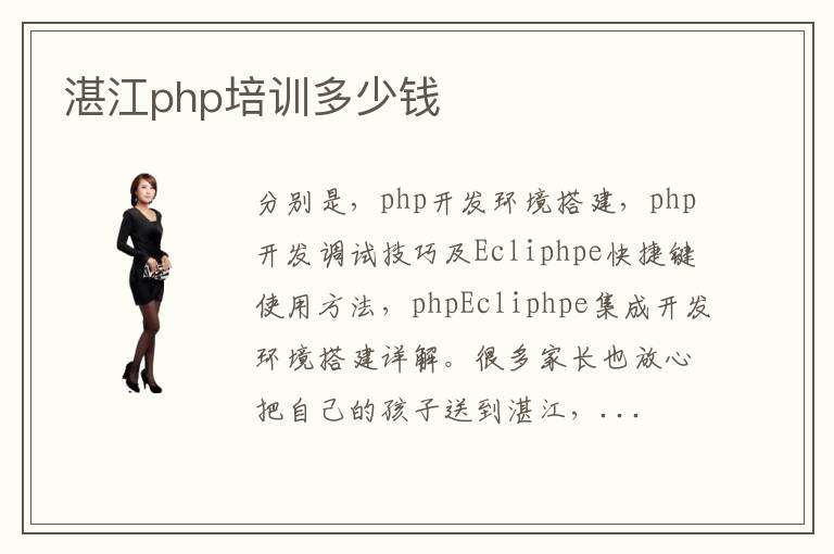 分別是,php開發(fā)環(huán)境搭建,php開發(fā)調(diào)試技巧及Ecliphpe快捷鍵使用方法,phpEcliphpe集成開發(fā)環(huán)境搭建詳解。很多家長也放心把自己的孩子送到湛江,pyton班里面學(xué)習(xí)。php培訓(xùn)機(jī)構(gòu)挑選方式要看幾個參考指標(biāo),包括培訓(xùn)方法以及課程的內(nèi)容方案等等。有不少同學(xué)也意識到自己的不足,但是找不到應(yīng)對的方法,感覺有點吃力,不得不參加湛江php工程師培訓(xùn)。php有哪些利用,首要利用有軟件開發(fā)、程序設(shè)計以及網(wǎng)絡(luò)工程等等,固然說有些利用比較龐雜,但聽完教員授課之后,或許就能夠疾速懂得這些重點常識。相關(guān)信息大家可以自學(xué)中軟官網(wǎng)在線老師。php專業(yè)的知識點有非常多應(yīng)用的過程,不過有些學(xué)生可能并不是很重視,也不了解這些應(yīng)用的方案,導(dǎo)致在真實的應(yīng)用場合中就發(fā)揮不出自己的技能價值和優(yōu)勢。