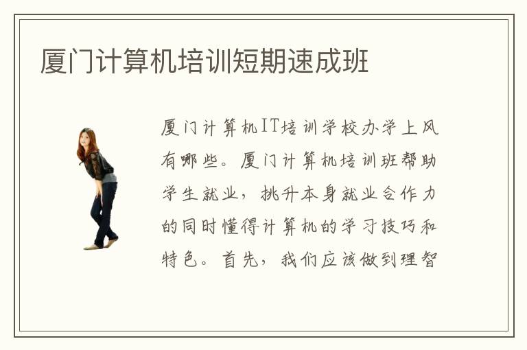 廈門計算機IT培訓學校辦學上風有哪些。廈門計算機培訓班幫助學生就業(yè),挑升本身就業(yè)合作力的同時懂得計算機的學習技巧和特色。首先,我們應該做到理智冷靜客觀,不要盲從,也不要輕易相信廣告或者陌生人的主動介紹,利益相關的人介紹終究不可靠,我們可以實地考察,畢竟眼見為實,耳聽為虛,看看一個計算機培訓機構(gòu)的辦學歷史與辦學規(guī)模,我們也可以從中獲取很多我們需要的信息,畢竟在這一方面造不了假,如果造假,那么這一個計算機培訓呢機構(gòu)也就確確實不應該存在了,如果做出來選擇,無論是哪一家廈門計算機培訓機構(gòu),都要靠自己努力,師傅領進門,成才靠個人。面臨將來的就業(yè)非常蒼茫的學生,或是關于計算機行業(yè)有著稠密學習樂趣的學生,都可以放松機會,盡力學好計算機專業(yè)。