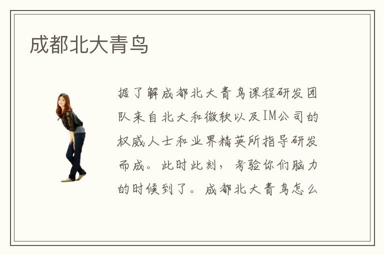 據(jù)了解成都北大青鳥課程研發(fā)團(tuán)隊來自北大和微軟以及IM公司的權(quán)威人士和業(yè)界精英所指導(dǎo)研發(fā)而成。此時此刻,考驗?zāi)銈兡X力的時候到了。成都北大青鳥怎么樣位置屬于成都市,而具體在哪里可以咨詢成都北大青鳥怎么樣的招待老師,老師們會耐心回答你所問的問成都北大青鳥怎么樣教學(xué)設(shè)施先進(jìn)嗎題。成都北大青鳥,環(huán)境優(yōu)美,四周非常的寂靜,很適合學(xué)生們在這里靜下心來學(xué)習(xí)??梢哉f辦學(xué)成果斐然,成為了業(yè)內(nèi)的標(biāo)桿。為此,做出學(xué)費以及相關(guān)費用收取的明細(xì)詳情介紹是相當(dāng)必要的,也是有益于彼此的。成都北大青鳥貴嗎。這個問題如果讓街上的路人回答,聽說過的,那便是好了,未曾聽過的,就算想夸或是想罵都是一無所知,無從下嘴的。還未走進(jìn)IT行業(yè),就已經(jīng)了解到這個行業(yè)需要有多么的專業(yè)才好,畢竟專業(yè)術(shù)語是那么的多,不了解的話我們又該如何應(yīng)用呢。