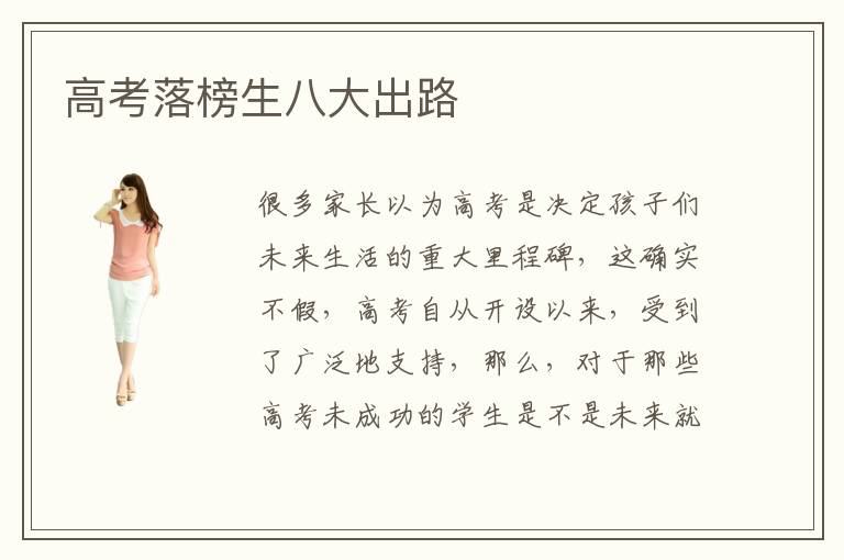 很多家長(zhǎng)以為高考是決定孩子們未來(lái)生活的重大里程碑,這確實(shí)不假,高考自從開設(shè)以來(lái),受到了廣泛地支持,那么,對(duì)于那些高考未成功的學(xué)生是不是未來(lái)就前途渺茫了呢?其實(shí)不然,要明白高考落榜生還有八大出路。高考落榜生八大出路具體是有哪些?高考落榜后可以選擇出國(guó)深造,或者還可以進(jìn)入到專業(yè)的培訓(xùn)機(jī)構(gòu)學(xué)習(xí)等等。那么,高考落榜生八大出路如何選擇呢?