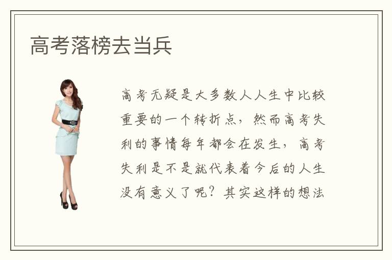 高考無疑是大多數(shù)人人生中比較重要的一個轉(zhuǎn)折點,然而高考失利的事情每年都會在發(fā)生,高考失利是不是就代表著今后的人生沒有意義了呢?其實這樣的想法是不正確的,高考失利后能做的事情有很多,重點是要有一顆為自己今后就業(yè)負責(zé)的心。高考落榜去當(dāng)兵就是其中一條出路,當(dāng)兵可以磨練自己的意志,退伍之后對自己的找工作也是很有幫助的,因此高考落榜去當(dāng)兵這個建議可以考慮。