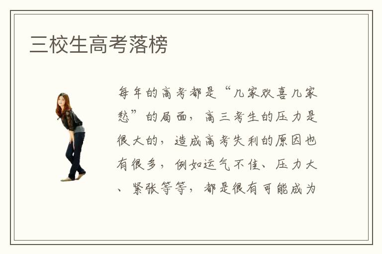 每年的高考都是“幾家歡喜幾家愁”的局面,高三考生的壓力是很大的,造成高考失利的原因也有很多,例如運氣不佳、壓力大、緊張等等,都是很有可能成為高考落榜的原因。在高考落榜以后不要氣餒,最重要的是要從悲傷中走出來,要善于觀察社會發(fā)展的形勢選擇適合自己并且具有廣闊發(fā)展前景的專業(yè)進行學(xué)習。那么,三校生高考落榜以后應(yīng)該怎么辦呢?三校生高考落榜還需要注意什么嗎?